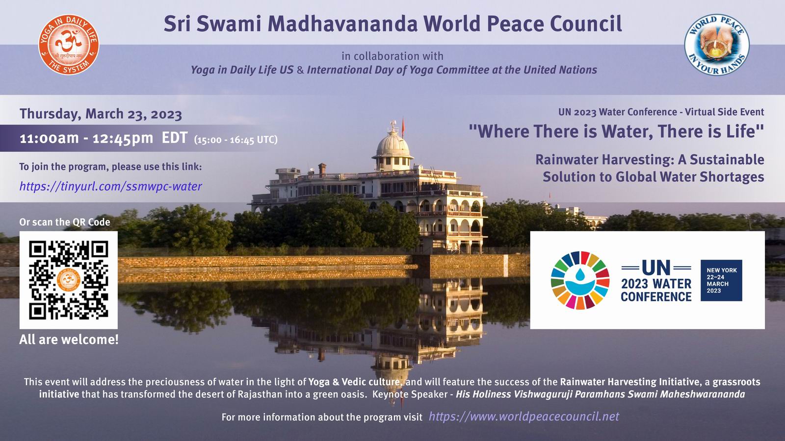 The Sri Swami Madhavananda World Peace Council in collaboration with Yoga in Daily Life USA and the International Day of Yoga Committee at the United Nations is hosting an on-line summit as part of the UN Water Conference 2023 and in honor of the United Nations decade dedicated to water. All are welcome to join!