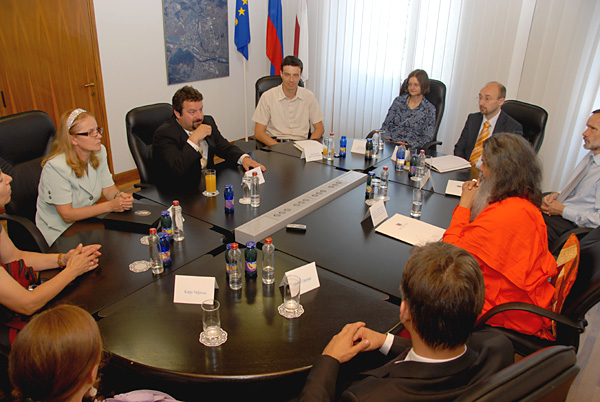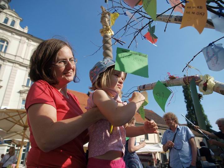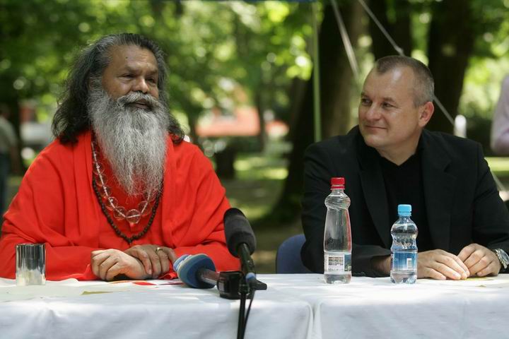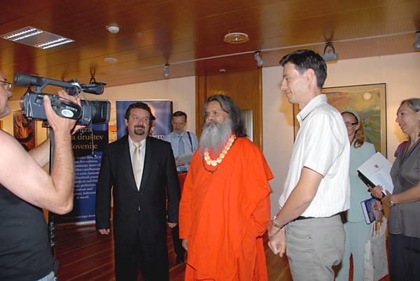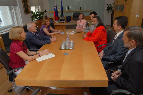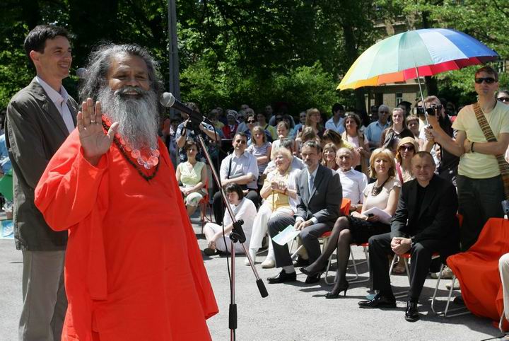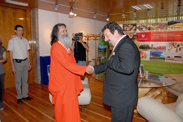 H. H. Swamiji’s visit to Slovenia started with an event GIVE ME PEACE!, where we all participated and which was organized by the Maribor Yoga in daily life society under the patronage of Maribor municipiality. The event brought together different organizations, societies, schools and individuals with a common desire to encourage peace. The honorary guest, H. H. Swamiji, met the Maribor mayor Franc Kangler and together they attended the event which was taking place in the town park.