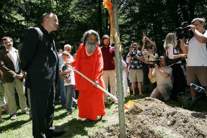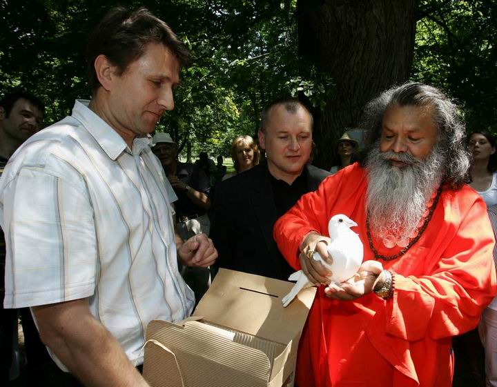 Primary school children prepared a short play and reminded everybody present to the significance of a clean and preserved environment for quality living of every person. After that the main part of the event took place, when H. H. Swamiji and the mayor planted the peace tree in the Town park. With the lime tree, Maribor joined six Slovene cities, Ljubljana, Kranj, Novo mesto, Portorož, Celje and Domžale, where H. H. Swamiji planted trees in Slovenia within his wide peace efforts as a symbol of endeavours for peace – peace within humans, peace among people, peace among all living beings, peace in the world. The event in the park finished with the flying off of the peace pigeon.