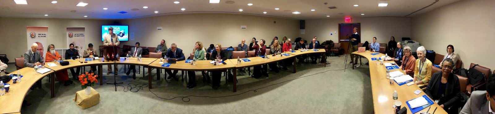 As well as HH Vishwaguruji, keynote speakers on the panel included: HE Mr. Kaha Imnadze, the Ambassador and Permanent Representative of Georgia to the UN; Mr. Ramu Damodaran, Chief of the United Nations Academic Impact Initiative; Ms. Denise Scotto, Chair of the IDY Committee at the UN; Dr. Uma Mysorekar, President of the Hindu Temple Society of North America; Prof. Dr. Péter Földesi, Rector of Széchenyi István University, Györ, Hungary; Mr. Swapnil Kothari, Founder of Indira Group of Institutions, India; Dr. Jana Long, executive of the Black Yoga Teachers Alliance, USA; and Ms Denis Licul (Kripadevi) the Secretary of SSMWPC and head of YIDL New York.