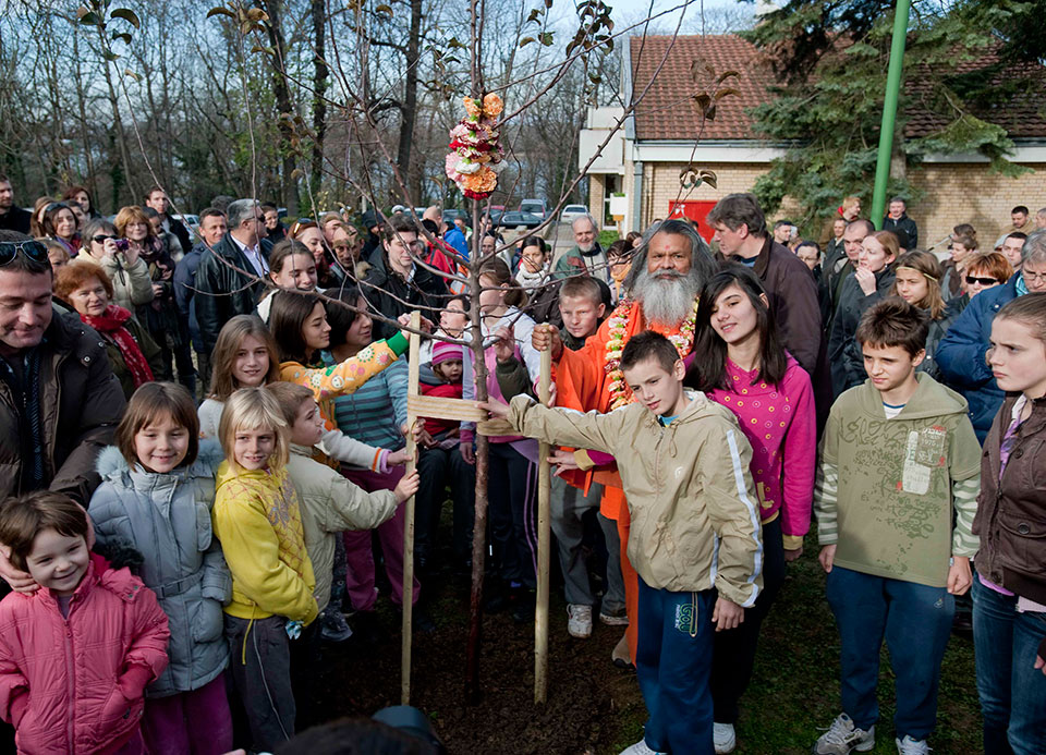Today on a cold but bright winter day in Novi Sad, Serbia, Europe, His Holiness Vishwaguruji planted his 50th World Peace Tree in the park of an orphanage village in the city of Novi Sad. He was officially greeted and introduced as one of the greatest humanitarian workers in Europe and worldwide by Mr. Vladimir Kopici, the Deputy Mayor of Novi Sad, and other officials from the City Council and the Assembly of Novi Sad. Hundreds of children as well as delegates and guests from several countries followed the ceremony. In his address His Holiness Vishwaguruji emphazised that this tree should stay as a symbol of Peace and at the same time shall fulfill the wishes of all who come and touch this tree with pure heart and wishes.