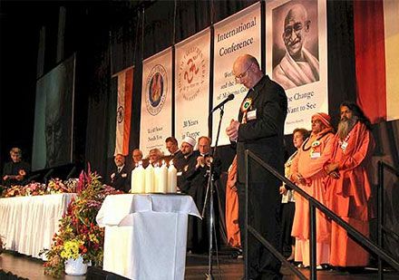 On October 5, 2002 the first International Conference of World Peace and the Message of Mahatma Gandhi took place in Vienna, Austria, initiated by Swamiji as one of his greatest contributions to these efforts. 2,000 participants attended from 40 countries, including ambassadors from 25 countries.
