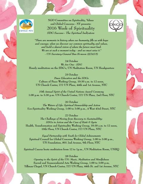 This year marks the tenth anniversary of the 'Week of Spirituality' at the United Nations (UN). This annual event, founded and hosted by the Committee on Spirituality, Values and Global Concerns - NY (CSVGS-NY), whose members represent non-governmental organizations (NGOs) from around the world, is generally held in the last week of October. The 'Week of Spirituality' features programs and insightful discussions about universal spirituality as a catalyst for the positive implementation of the UN Sustainable Development Goals (SDGs).